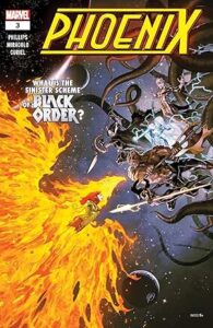 The Black Order (Ebony Maw, Black Dwarf, Supergiant, Cull Obsidian and Proxima Midnight) were apparently sent to the moon by Thanos in order to recruit the Asgardian zombies as an army. They don’t put up much of a fight against Phoenix before departing, but then once she’s laid the zombies to rest, they have no mission. Ebony Maw in particular regards Phoenix as Jean Grey, and as an interloper in cosmic matters. At the end of the issue, they show up to form an alliance with Perrikus.