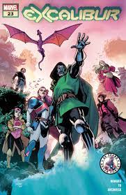 COVER / PAGE 1. Dr Doom leading a somewhat reluctant Excalibur. The composition loosely echoes the cover of Excalibur vol 1 #1.
