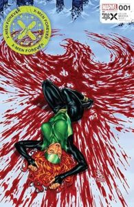 COVER / PAGE 1. An unconscious Jean Grey lying in a Phoenix-shaped pool of blood in what appears to be a snowbound forest. This doesn’t happen in the issue, though we do see Jean lying in a circle of blood on page 12.